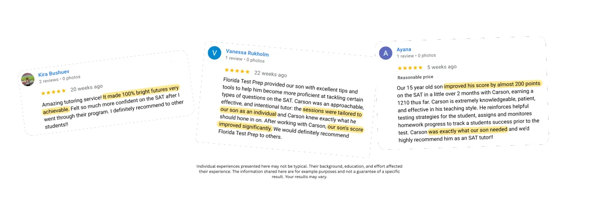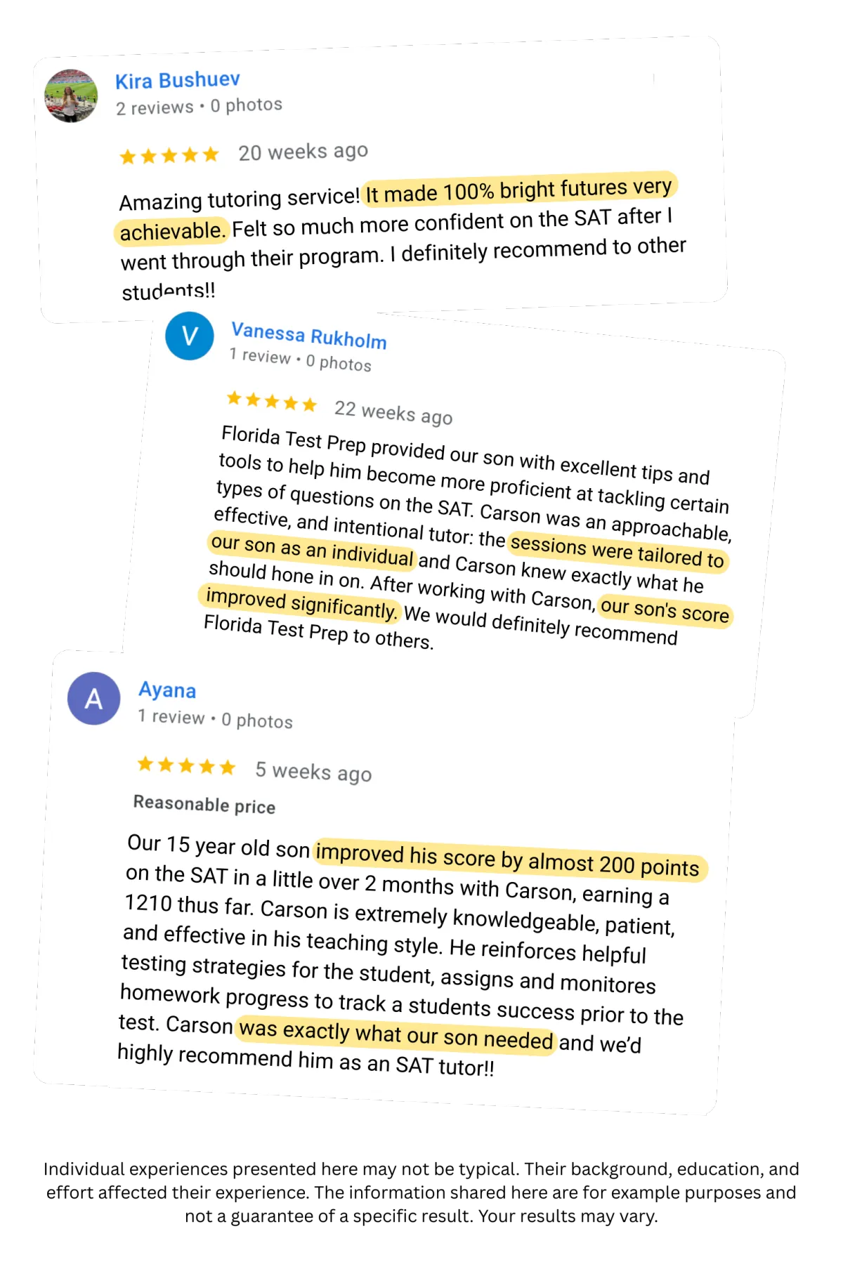 Ms. Gonzalez’s son, Alex (11th grade), had a schedule packed with APs and activities. He needed a higher SAT score to stay competitive for UF and FSU—we helped him secure the score needed for admission and 100% Bright Futures.